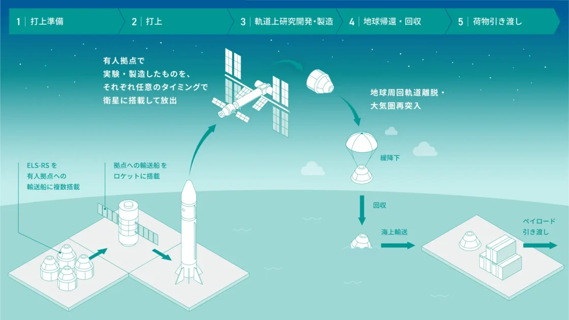 ELS-RSは輸送船に搭載されて宇宙ステーションに運ばれ、拠点で実験・製造されたサンプルを任意のタイミングでカプセル内に搭載。その後、地球の狙った場所に自律的に帰還する。