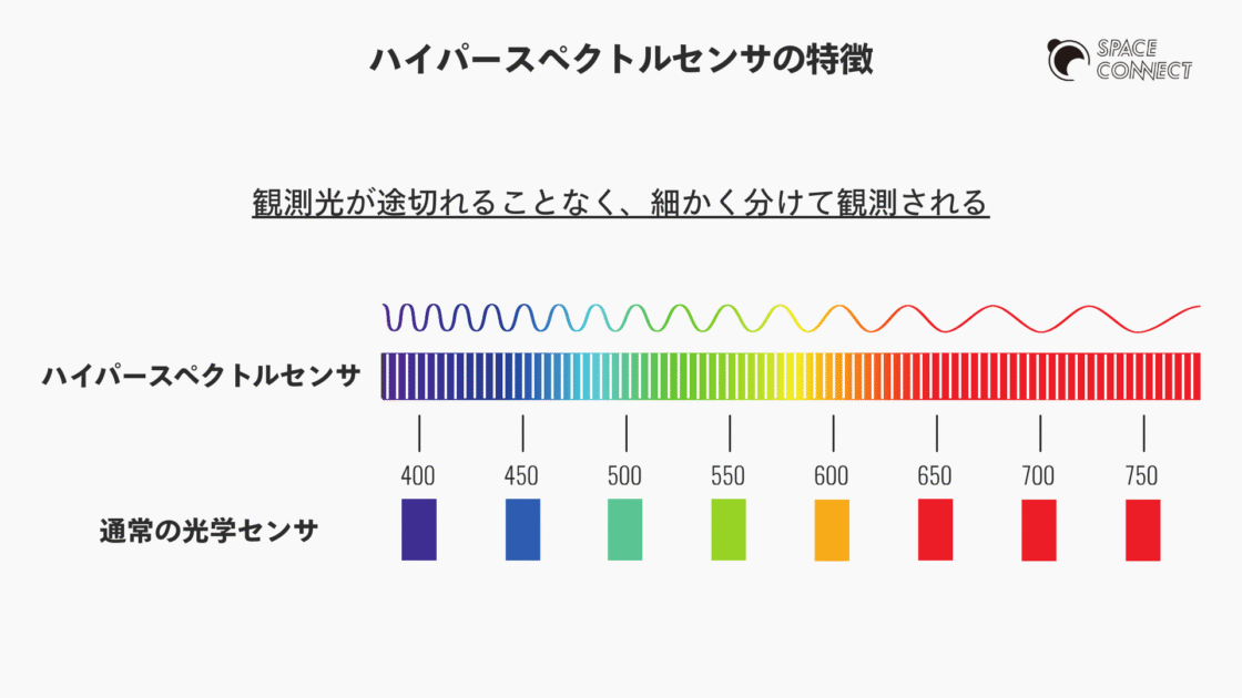 ハイパースペクトル観測は、物体が反射した光を捉えて観測する光学観測の一種である。通常の光学衛星よりも波長帯域と波長分解能が高く、様々な光を細かく分けて観測することで、色だけでなく、物質の違いをより詳しく見分けられる点が特徴である。
