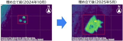 分解能10mの光学衛星データを用いて変化検知を行った結果、2024年10月から2025年5月の間に、バーク・カナダ礁南西部で新たな埋め立てが進行していたことが確認された。